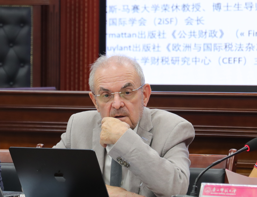 9月29日,由广西师范大学法学院、广西地方法治与地方治理研究中心、广西涉外法律服务研究院主办,法学院研究生会承办的“独秀法学大讲堂”第六十六讲在雁山校区模拟法庭举行。法国艾克斯-马赛大学Thierry LAMBERT(蒂埃里·兰伯特)教授以“数字经济背景下税收的法律问题”为题做学术讲座,讲座由学院杨祝顺副院长主持,陶斌智副院长与谈,青年教师韦凯宏博士担任同声翻译,我院一百五十余名研究生及桂林市税务局相关人员列席旁听。