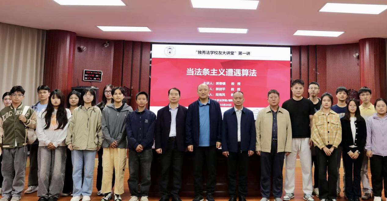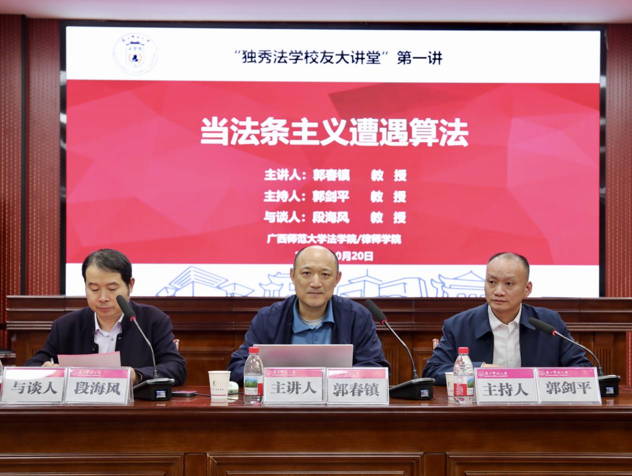 10月20日晚,由广西师范大学法学院、广西地方法治与地方治理研究中心主办的“独秀法学校友大讲堂”系列活动首场讲座,在雁山校区模拟法庭拉开帷幕。我院杰出校友、教育部“长江学者奖励计划”青年学者、同济大学法学院特聘教授郭春镇教授,以“当法条主义遭遇算法”为题,为“独秀法学校友大讲堂”带来首场精彩讲座。讲座由学院院长郭剑平主持,段海风教授与谈。