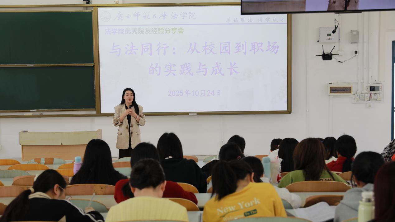 10月24日,广西师范大学法学院举办了一场主题为“与法同行:从校园到职场的实践与成长”的院友经验分享会。2022级学生齐聚一堂,聆听优秀院友、广西同望律师事务所合伙人徐肖烨律师带来的精彩分享。