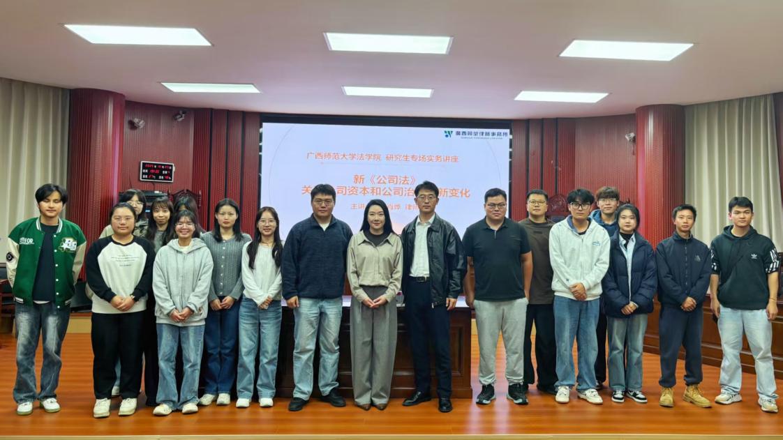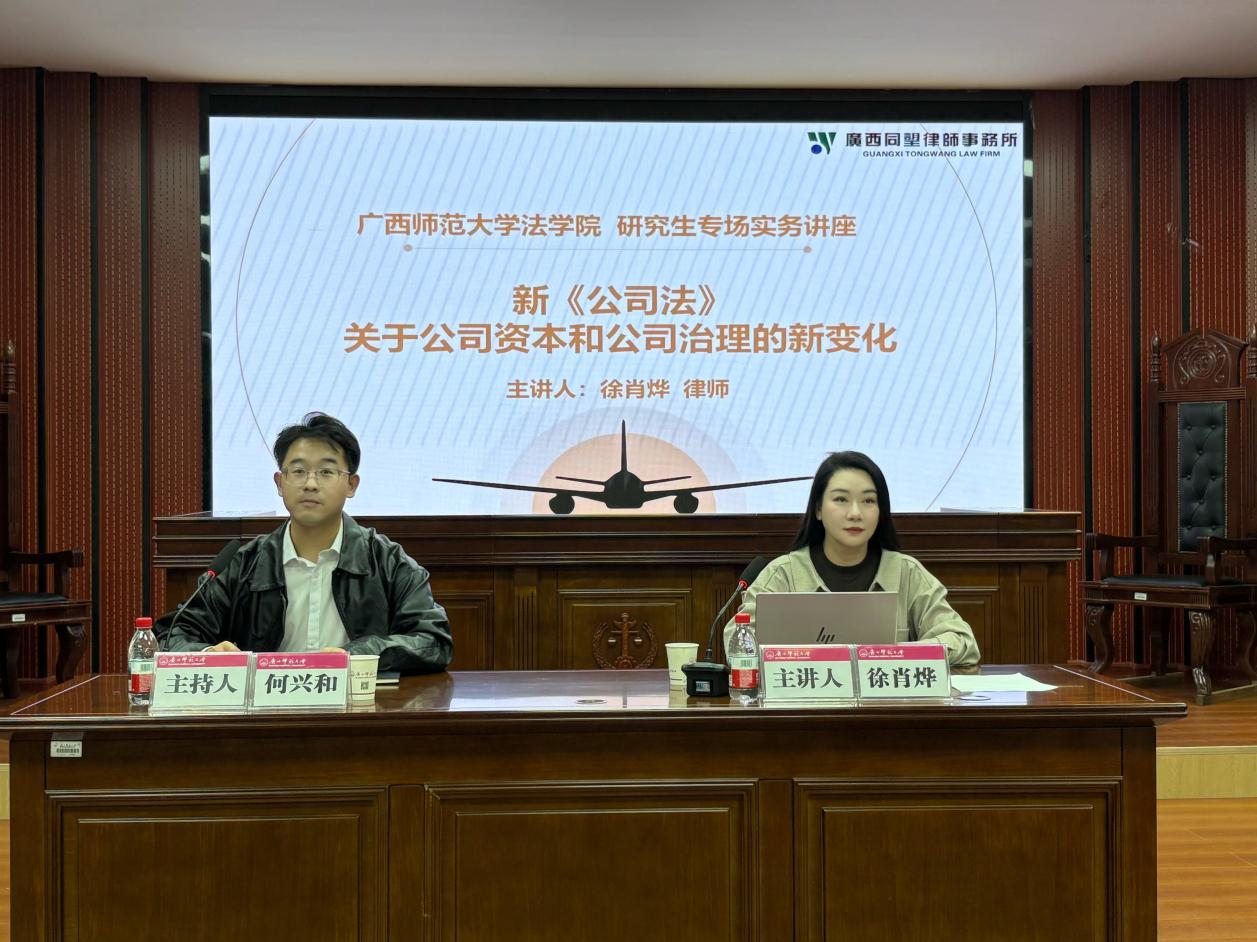 10月23日晚,“独秀法学校友大讲堂”第二讲在雁山校区模拟法庭开讲。广西同望律师事务所合伙人徐肖烨律师受邀主讲,以《新 〈公司法〉 关于公司资本和公司治理的新变化》为题,为我院师生带来专题分享,法学院何兴和老师担任主持。