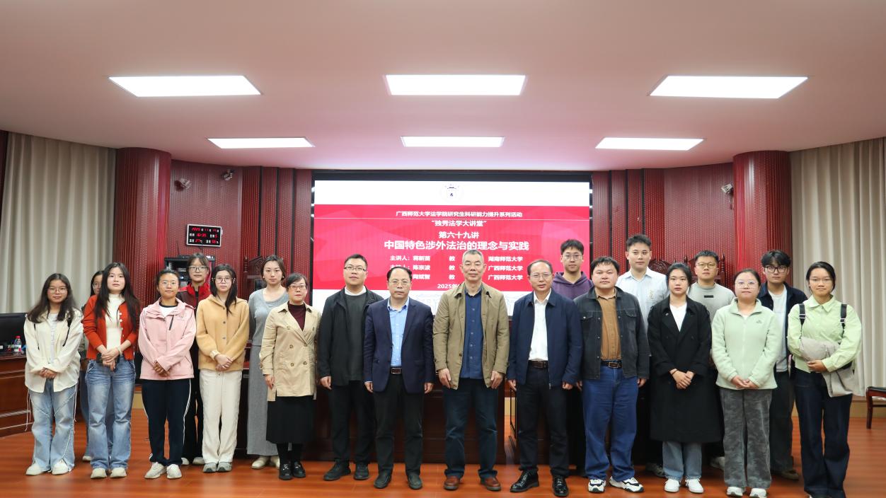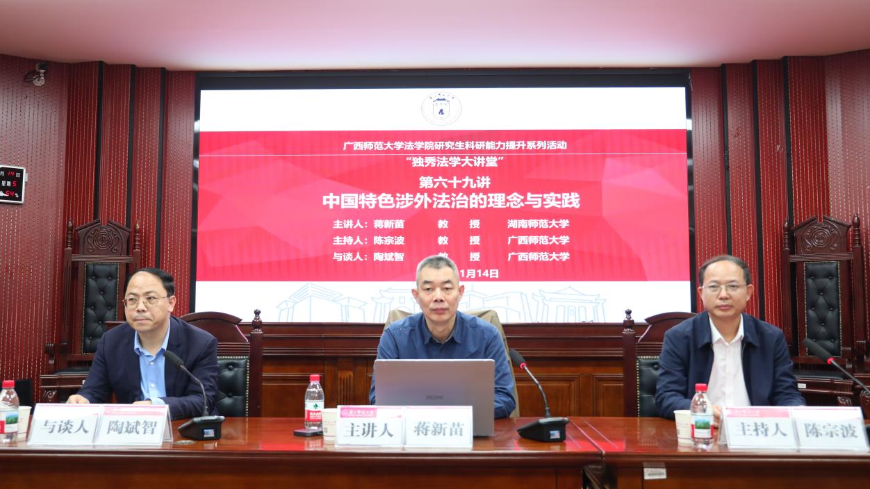 11月14日下午,由广西师范大学法学院、广西地方法治与地方治理研究中心、广西涉外法律服务研究院联合主办,法学院研究生会承办的“独秀法学大讲堂”第六十九讲,在雁山校区模拟法庭顺利举行。本次讲座特邀湖南师范大学蒋新苗教授主讲,以《中国特色涉外法治的理念与实践》为题展开深度学术分享。讲座由法学院陈宗波教授主持,陶斌智教授担任与谈人,我院150余名师生参加了讲座。