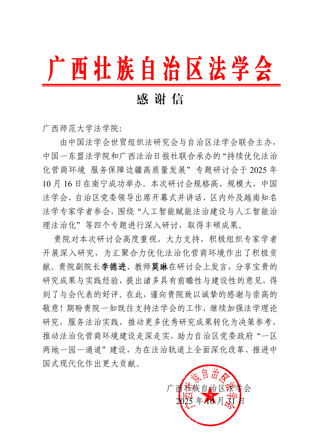 近日,广西壮族自治区法学会向我校发来感谢信,对广西师范大学法学院在“持续优化法治化营商环境 服务保障边疆高质量发展”专题研讨会中的积极贡献给予充分肯定与衷心感谢。学院对此次研讨会高度重视、大力支持,积极组织专家学者开展深入研究,学院副院长李德进、教师莫琳在研讨会上发言,分享研究成果与实践经验,提出了具有前瞻性与建设性的意见,为汇聚合力优化法治化营商环境贡献智慧与力量。