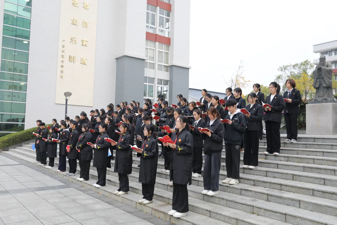 12月4日清晨,晨曦微露。学院师生身着统一服装,在校园整齐列队、庄严肃立。随着领读人开启诵读,宪法晨读活动正式拉开帷幕。师生齐声诵读宪法核心条款,铿锵有力的声音回荡校园,让宪法权威与法治精神深深根植于心间。