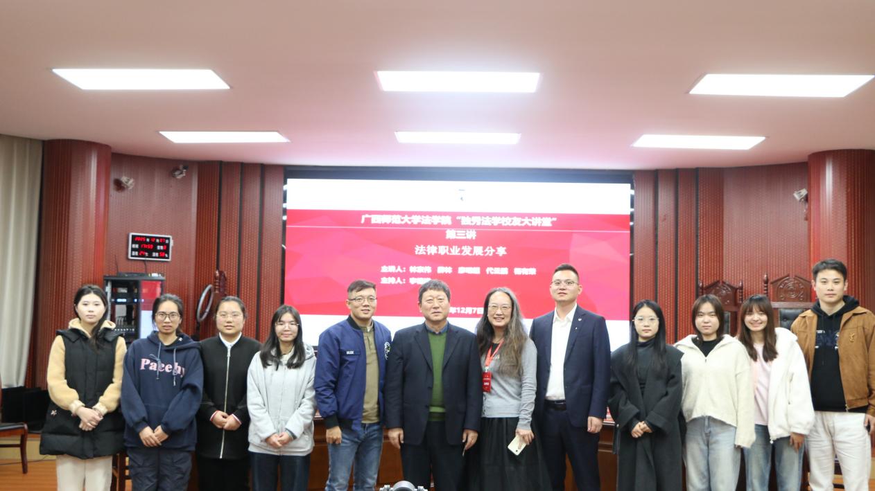 12月7日下午,由广西师范大学法学院、广西地方法治与地方治理研究中心、广西涉外法律服务研究院主办,法学院研究生会承办的“独秀法学校友大讲堂”第三讲在雁山校区模拟法庭举行。本次讲座聚焦法律职业发展,林京伟、薛林、廖明超、代云鹏、杨有荣、许晓彤六位优秀校友同台分享实务经验,为在校学子答疑解惑、指引职业方向。讲座由法学院副院长李德进主持,学院100余名研究生参与学习。