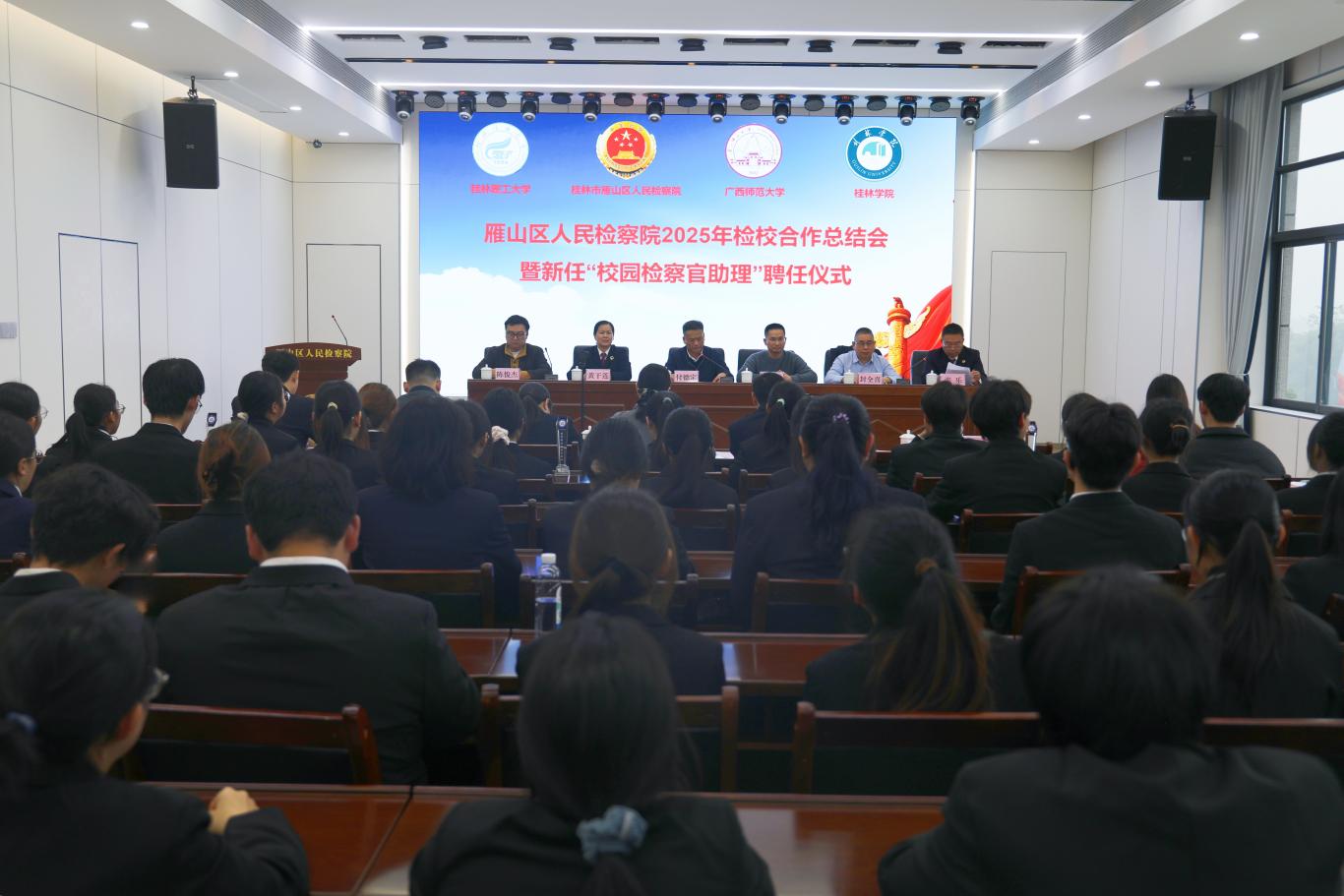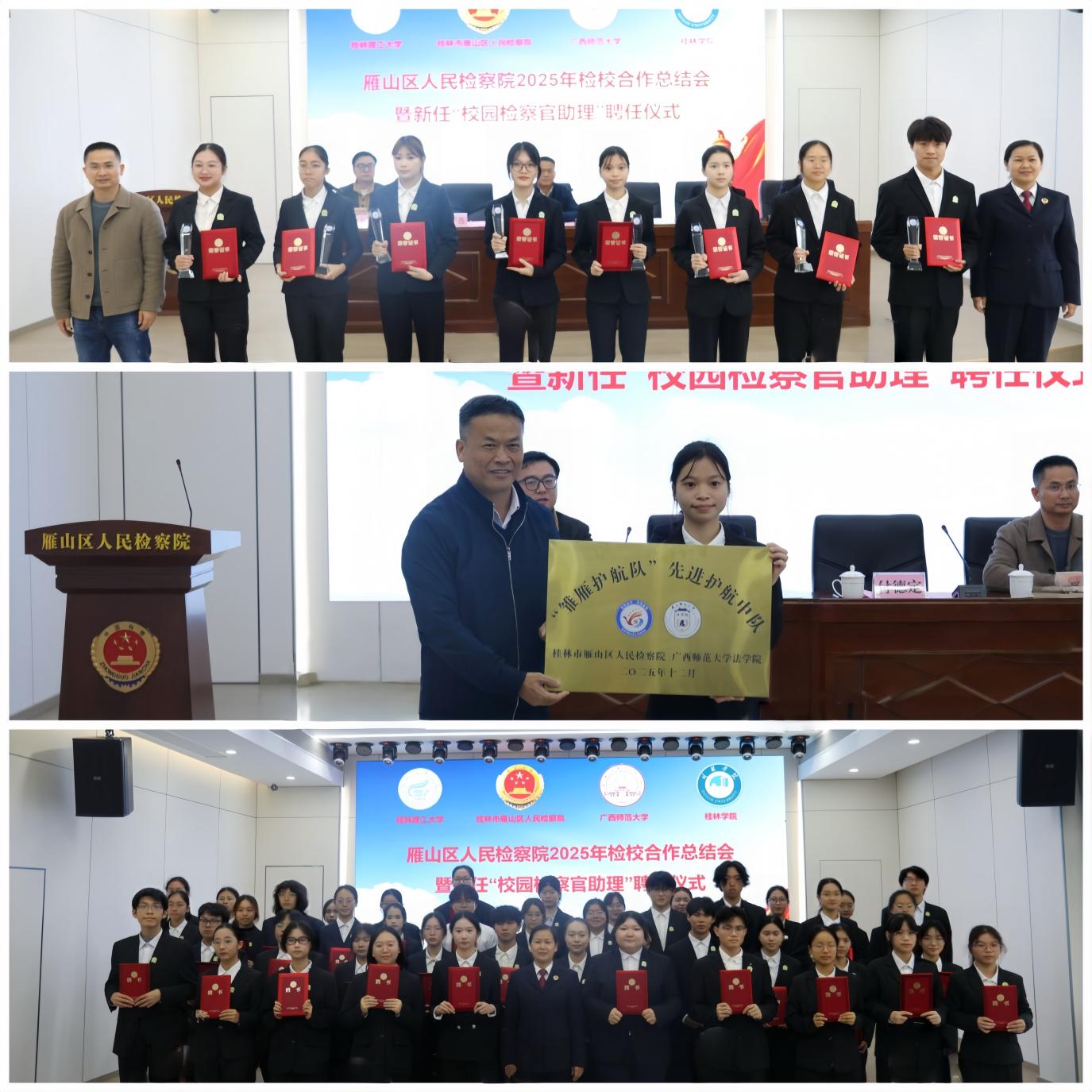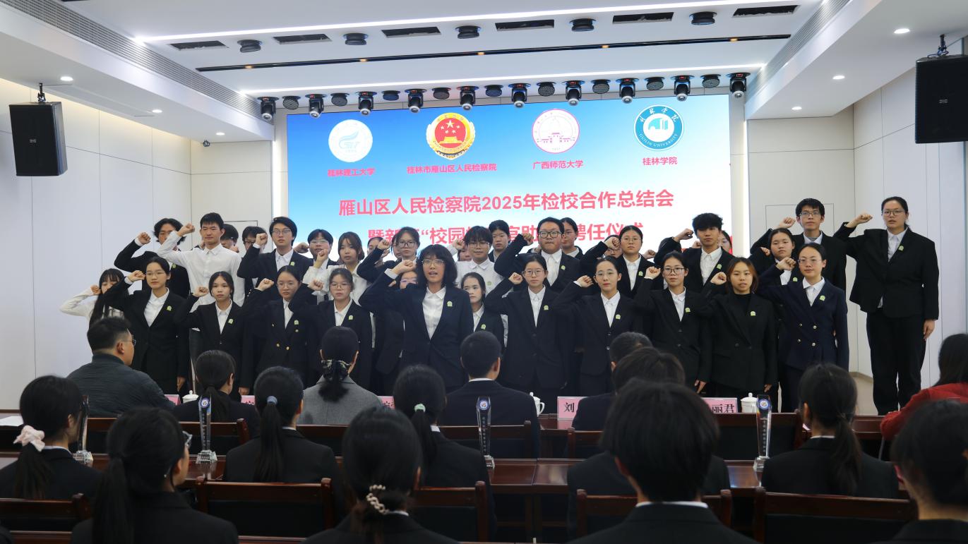 12月12日下午,雁山区人民检察院举行2025年检校合作总结会暨新任“校园检察官助理”聘任仪式。雁山区委常委、政法委书记付德定,雁山区人民检察院检察长黄干莲,广西师范大学法学院党委书记窦武及高校相关负责人出席本次活动。