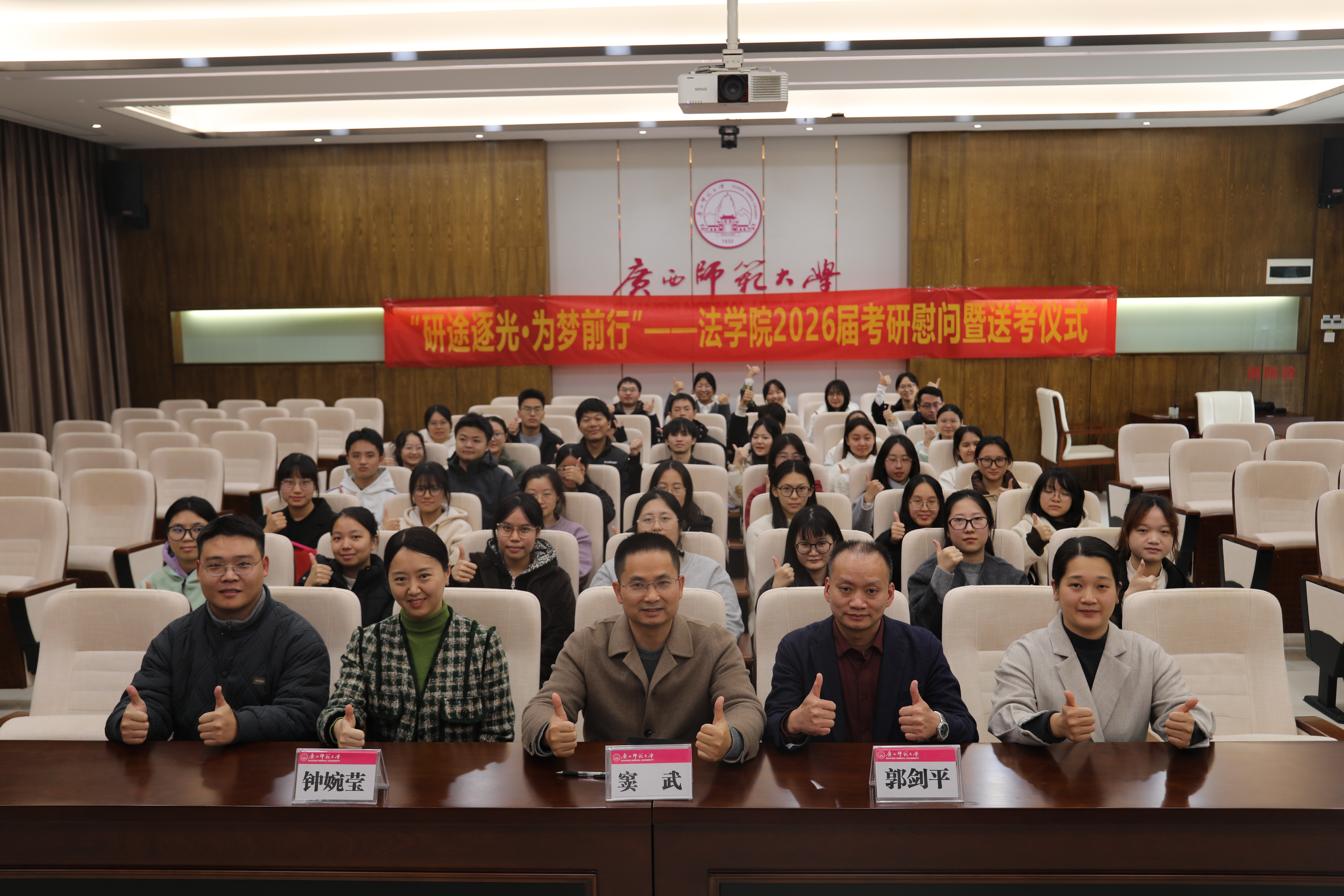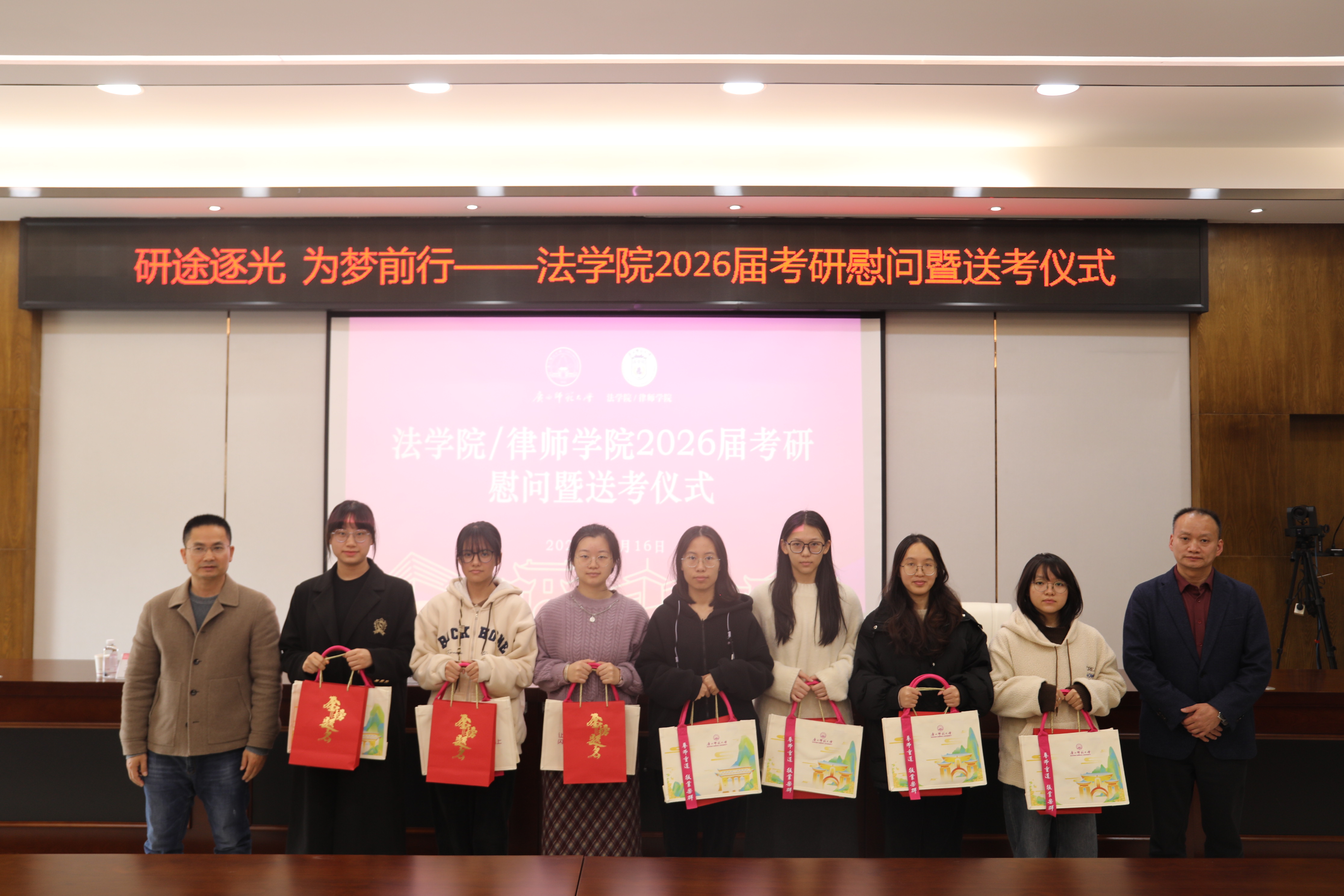 为助力考研学子舒缓备考压力、调适迎考心态、坚定追梦信心,12月16日,法学院举行“研途逐光·为梦前行”2026届毕业生考研慰问暨送考仪式。学院党委书记窦武、院长郭剑平、党委副书记钟婉莹、团委书记吴纬及2026届全体考研学子齐聚一堂,共话备考征程,共寄美好期许。