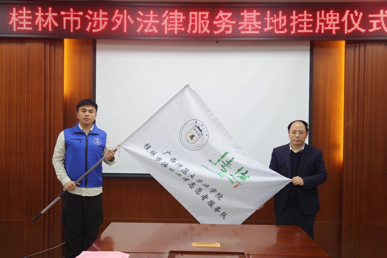 会上,郭剑平与吕开运共同为桂林市涉外法律服务基地揭牌。陶斌智为桂林市涉外法律服务志愿者服务队授旗。