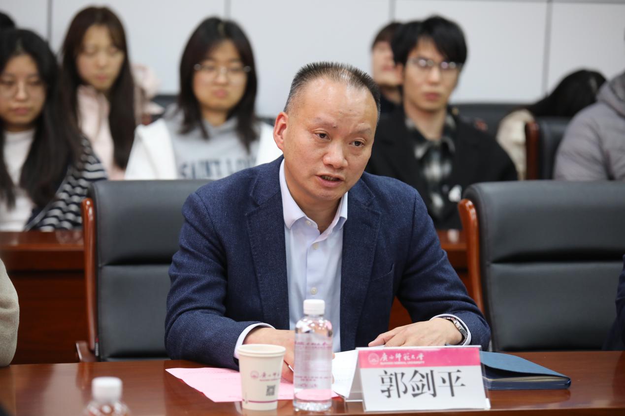 郭剑平致欢迎辞。他表示,此次与桂林市司法局共建桂林市涉外法律服务基地是深化校地合作、促进优势互补的务实举措,将共同打造“专业化”服务高地、构建“国际化”研究平台、培育“复合型”法治人才。郭剑平指出,基地将以法治护航开放,以合作共赢未来,为桂林打造世界级旅游城市、为广西建设新时代壮美广西作出更大贡献。
