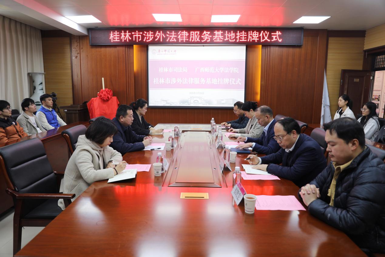 为深入贯彻习近平法治思想,全面落实党的二十届四中全会“加快涉外法治体系和能力建设”的战略部署,充分发挥涉外法律服务对高水平开放和高质量发展的法治保障作用,12月30日,桂林市涉外法律服务基地挂牌仪式在广西师范大学法学院顺利举行。桂林市司法局党组成员、副局长吕开运,广西师范大学法学院院长郭剑平、党委副书记钟婉莹、副院长陶斌智,桂林市委依法治市办秘书科相关负责人及法学院师生代表出席了本次挂牌仪式。