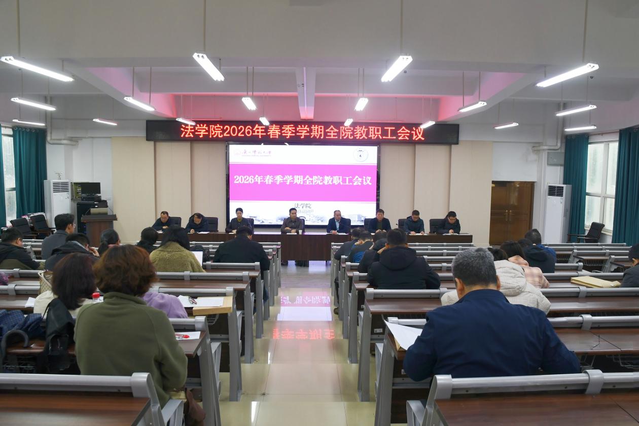 为统一思想、凝聚共识、明确任务,确保2026年春季学期各项工作开好局、起好步。2月28日下午,法学院在育才校区文二楼0214报告厅召开2026年春季学期全体教职工大会。学院领导班子和全体教职工参加会议。会议由学院党委副书记钟婉莹主持。