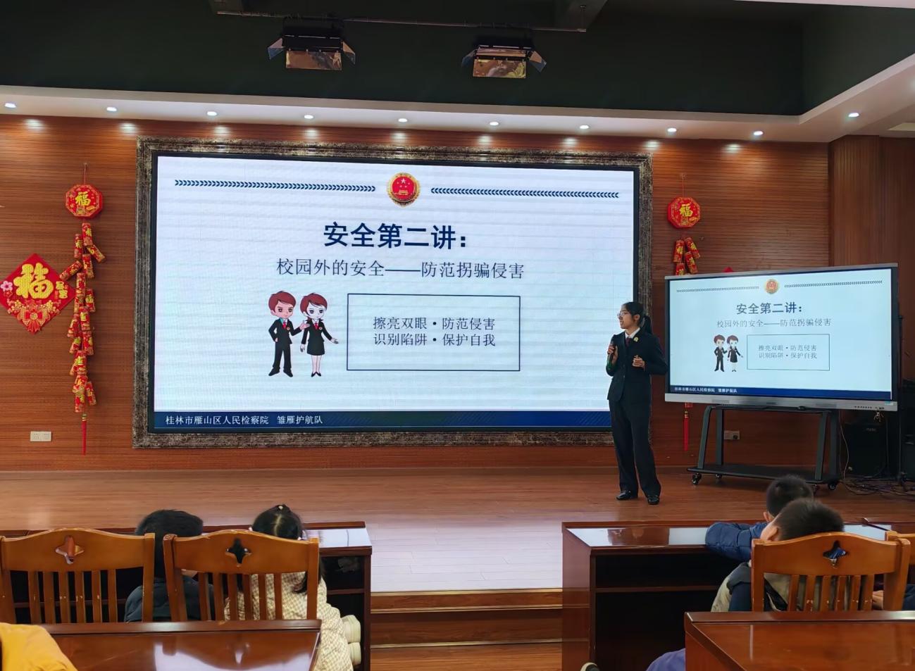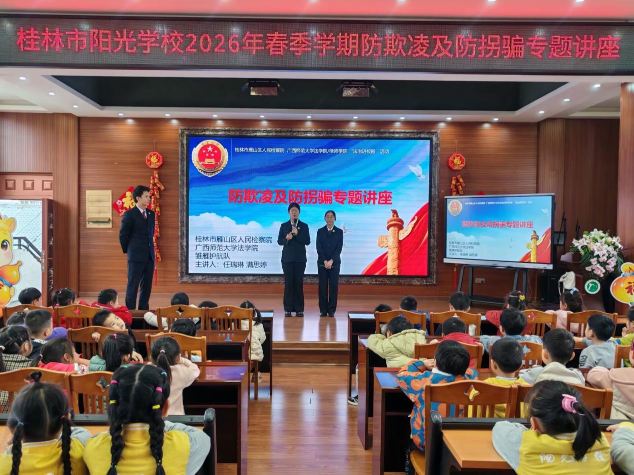 为传承和弘扬雷锋精神,深入推进青少年法治教育,进一步增强学生法治观念,提升自我保护能力,近日,雏雁护航队先后走进桂林市阳光学校、桂林市榕湖小学,开启雷锋宣传月“法治进校园”主题宣讲活动。本次宣讲聚焦防范校园欺凌与防范拐骗侵害两大主题,精准对接小学生成长需求,筑牢未成年人安全防护网。