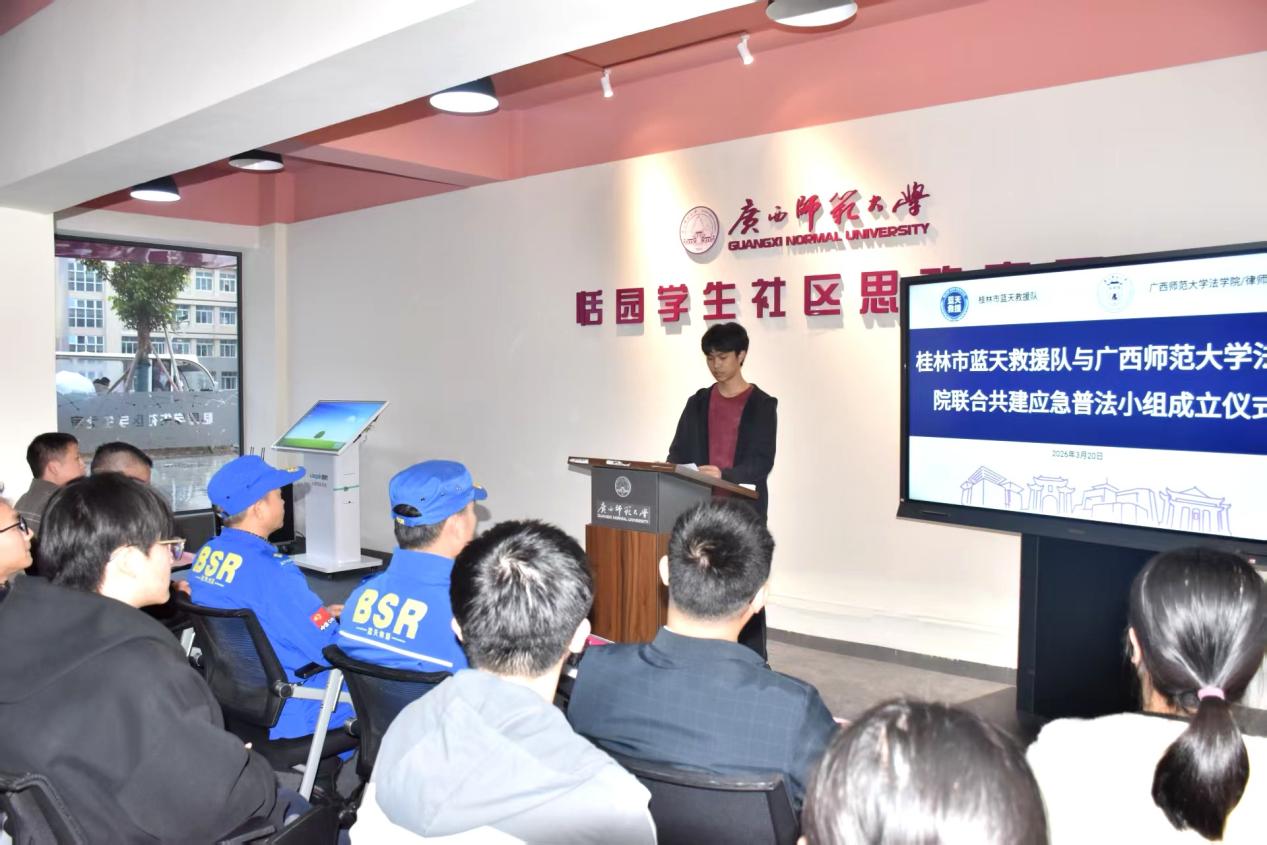 为深入贯彻落实国家关于应急管理体系和能力现代化建设的决策部署,增强高校师生及社会公众的应急避险能力与法治素养,3月20日,由广西师范大学法学院与桂林市蓝天救援队联合组建的“应急普法小组”正式启动,成立仪式在雁山校区恬园学生社区思政家园举行。广西师范大学法学院相关领导、师生代表与桂林市蓝天救援队核心队员共同出席了本次活动。