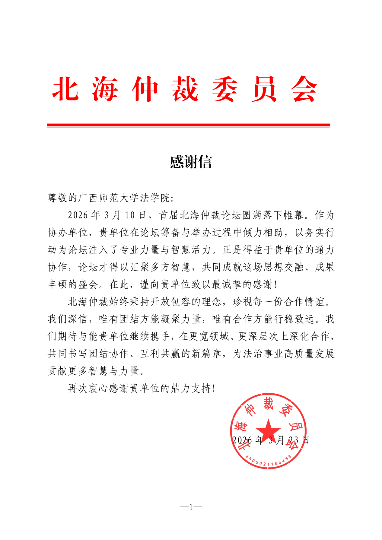 近日,广西师范大学法学院收到来自北海仲裁委员会的感谢信,信中就我院在首届北海仲裁论坛筹备与举办期间给予的大力支持与协作致以诚挚谢意。