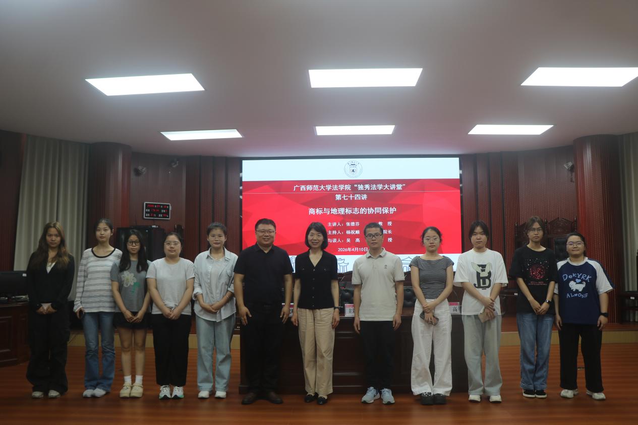 4月10日下午,由广西师范大学法学院、广西地方法治与地方治理研究中心主办,广西师范大学法学院研究生会承办的“独秀法学大讲堂”第七十四讲在雁山校区模拟法庭顺利举行。郑州大学法学院知识产权学科带头人、河南省知识产权研究会副会长张德芬教授为我院师生作题为《商标与地理标志的协同保护》的学术讲座。讲座由广西师范大学法学院杨祝顺副院长主持,吴高教授担任与谈人。